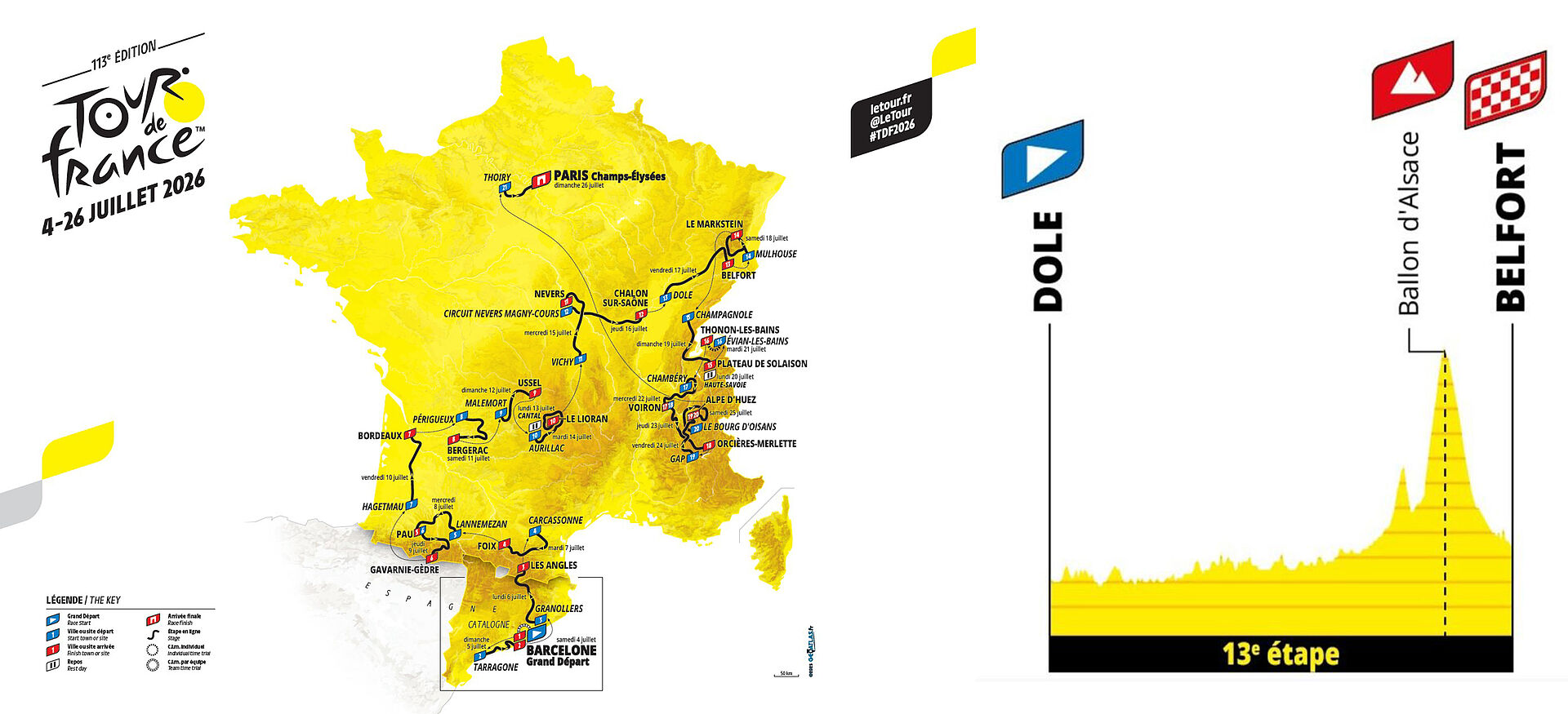 « Belfort : une halte classique du Tour » souligne Christian Prudhomme, Directeur du Tour de France, à l'annonce du parcours du Tour de France 2026. Le vendredi 17 juillet 2026, les coureurs s’élanceront de Dole pour la plus longue étape du Tour : 205 km et 2 500 m de dénivelé positif. Le parcours traversera le Jura, le Doubs, la Haute-Saône, les Vosges et le Territoire de Belfort, avec le Ballon d’Alsace : « Une seule étape dépasse la barre des 200 kilomètres sur le Tour 2026. Son profil atypique favorise les baroudeurs, mais la formation d’une échappée pourrait mettre du temps à se décanter. Il faudra attendre de passer Besançon, puis de saluer Thibaut Pinot dans son fief de Mélisey, avant d’entrevoir la grande difficulté du final. C’est en allant chercher le Ballon d’Alsace, 121 ans après la première étape de montagne du Tour, qu’il sera possible de faire la différence pour plonger en vainqueur sur Belfort. » confie Christian Prudhomme.