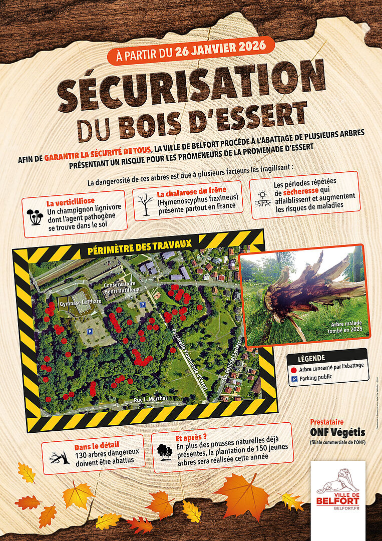 Depuis 2024, la Ville de Belfort travaille en collaboration avec l’Office national des forêts (ONF) afin d’évaluer l’état des arbres présents sur la promenade et dans le bois d’Essert. Ces expertises ont révélé la présence de plusieurs arbres fragilisés, présentant un risque de chute, notamment en raison de leur âge, de maladies ou de conditions climatiques de plus en plus extrêmes.