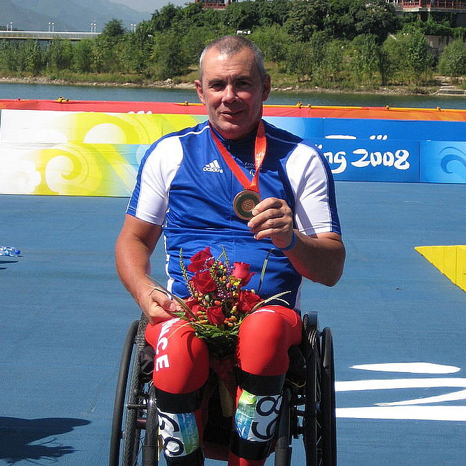 Alain Quittet, âgé de 52 ans, remporte la médaille de bronze en hand-bike* dans l’épreuve du contre-la-montre. Il participe à de multiples marathons (Paris, New York…) et est l’un des meilleurs athlètes hand-bike de la planète. Une blessure à l’épaule l’oblige à changer de discipline : il choisit le para-tir sportif, une discipline dans laquelle il va aussi briller.