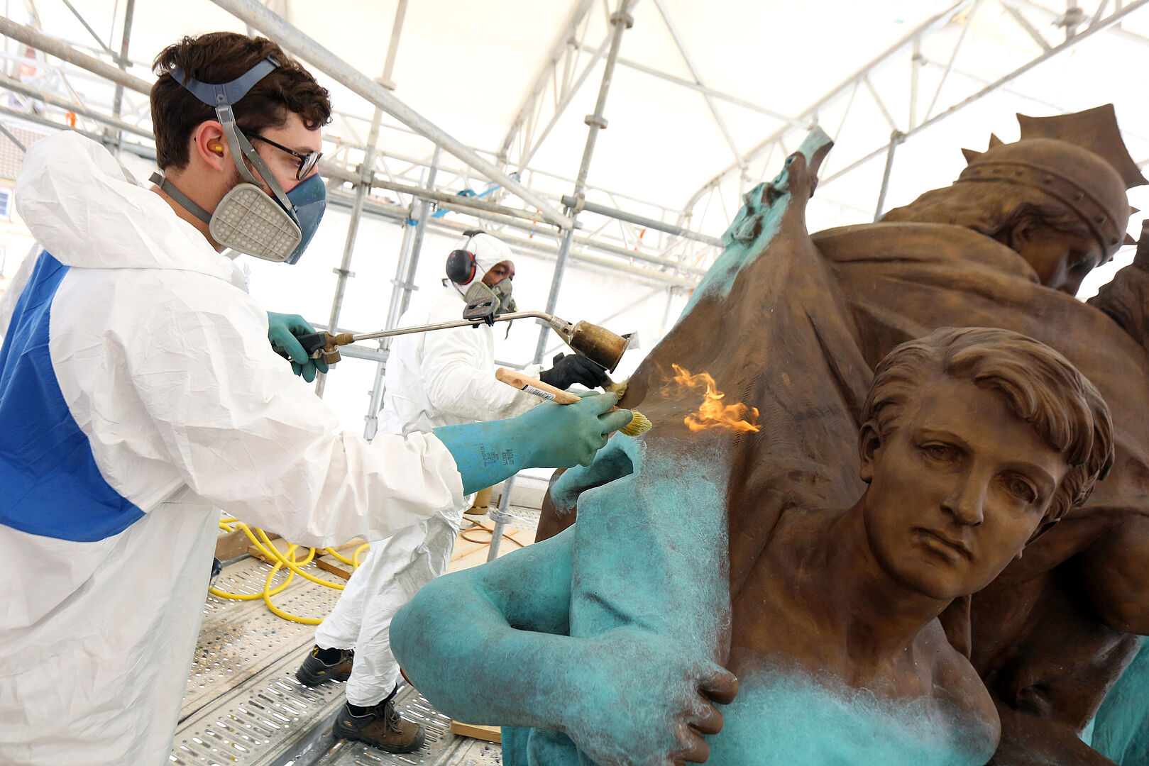 Dans le cas du monument des Trois sièges, après sablage intégral des statues, deux couches de protection sont appliquées à froid et à chaud pour redonner aux statues toutes les nuances de leur couleur d’origine. Le bronze est chauffé à 100°C pour provoquer une réaction chimique utile à la bonne tenue de la protection appliquée.