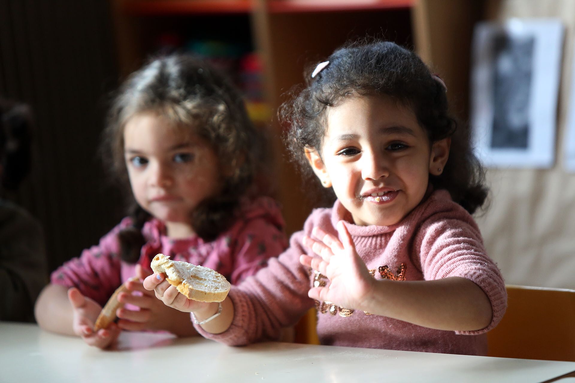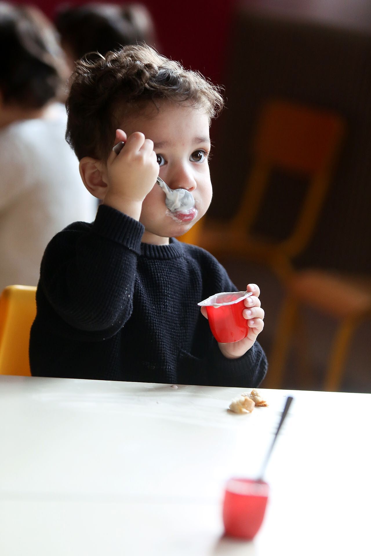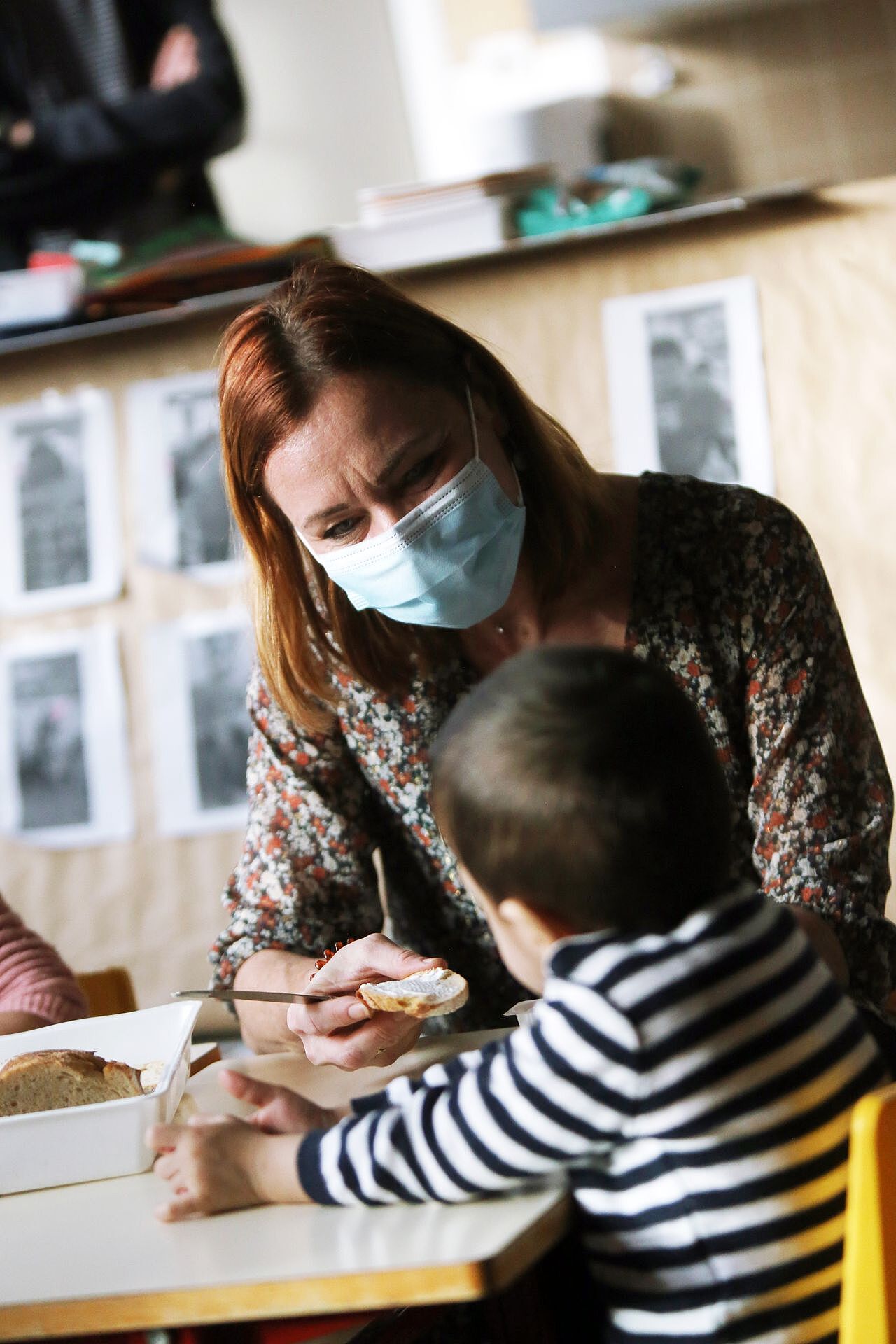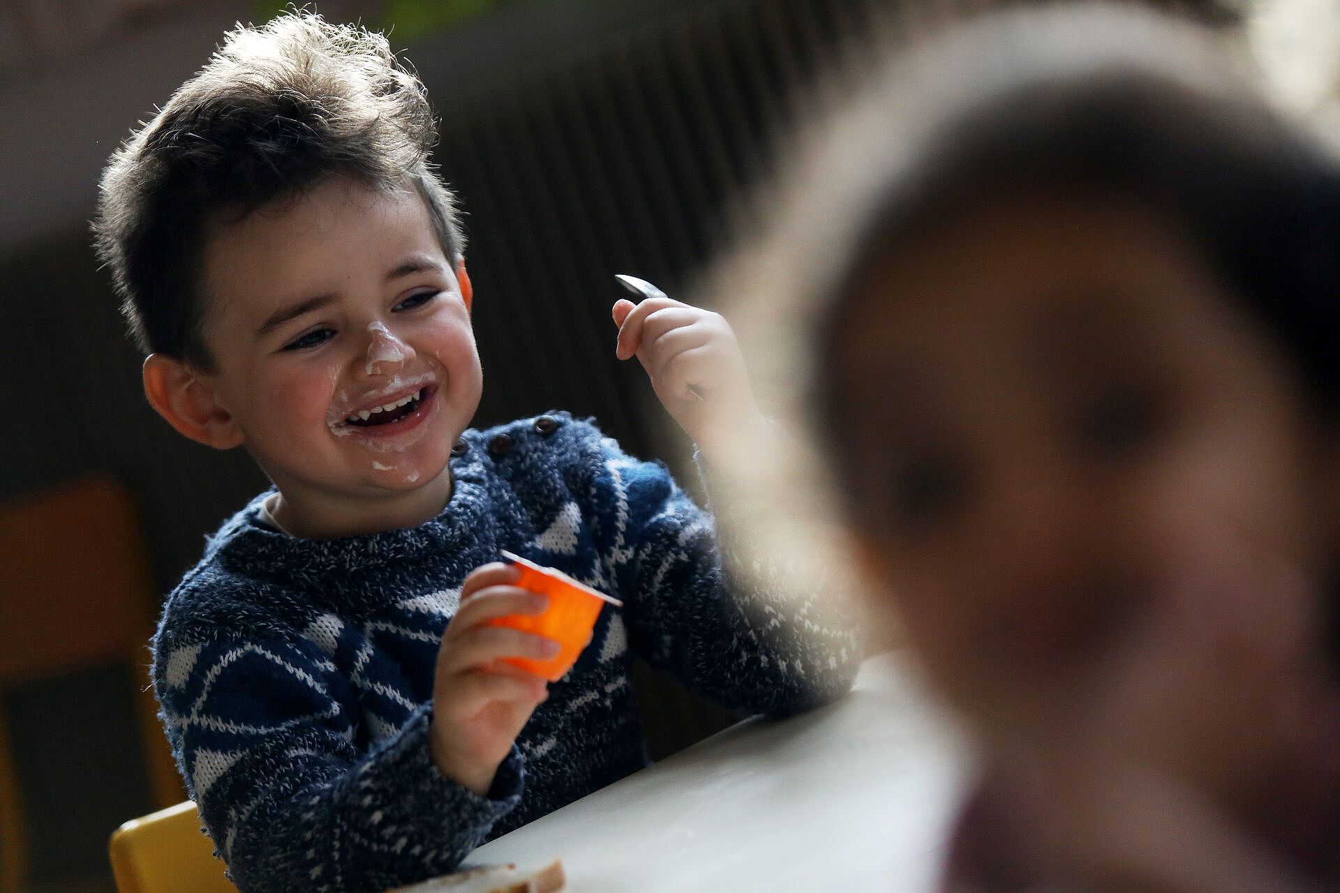 Jeudi à 9 h 30, en classe de maternelle à l'école Pierre Dreyfus Schmidt, c'est l'heure du petit-déjeuner avec les camarades de classe. Les 21 petits écoliers âgés de 2 ans se réunissent à table autour de leur maîtresse et directrice d'école, Céline Fahy, pour partager le premier repas de la journée.