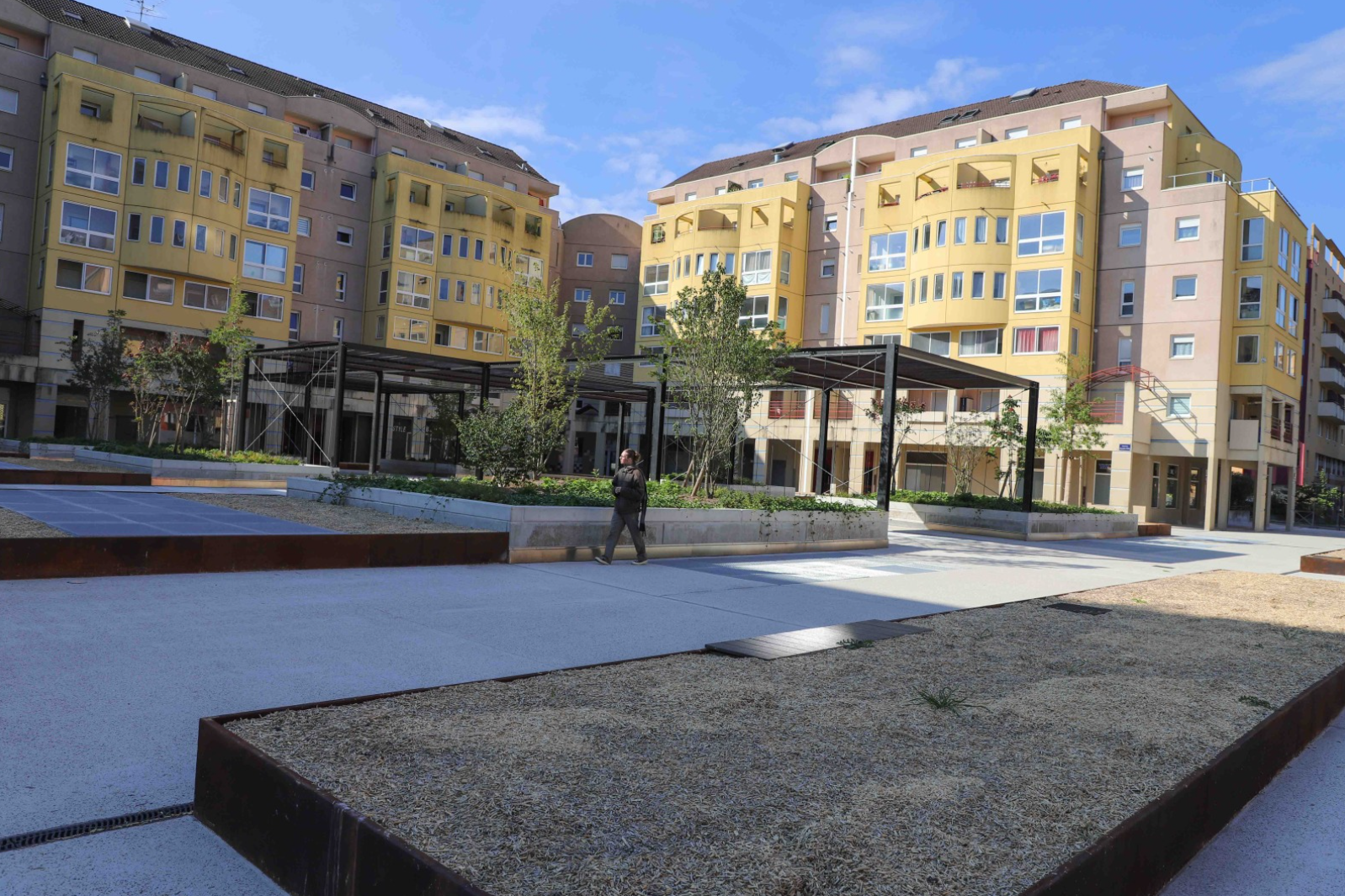 Déminéraliser la place : c’est l’un des principaux objectifs de cette transformation pour créer un véritable îlot de fraîcheur en ville. Les dalles sont ainsi remplacées par 6 îlots arborés en pleine terre, ainsi que des bacs de plantation hors sol.