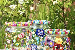 Atelier décoration de petits pots en verre avec des fleurs peintes au coton-tige.
