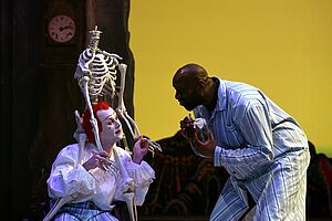 L’image réductrice qui lui colle à la peau depuis que le terme est passé dans le langage courant nous conduit à sous-estimer souvent la complexité du personnage, or sa psychologie se résume à bien plus qu’à celle d’un simple coureur de jupons. En prenant ici l’apparence d’un clown blanc hanté par la figure du Commandeur — et la promesse d’une mort certaine, évoluant auprès de trois musiciens dans une ambiance de cabaret et un somptueux décor de porcelaine et de tapisserie d’Aubusson, voilà un Dom Juan où se croisent les styles, les textes et les générations, pour une relecture du mythe où l’humour le dispute au tragique.
